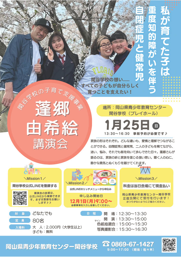 重度知的障がいを伴う自閉症児と健常児を育て、その様子をInstagramに紹介、全国各地で講演会もされている大人気インフルエンサーの蓬郷由希絵さん。1/25(日)に閑谷学校で講演会が決定しました。