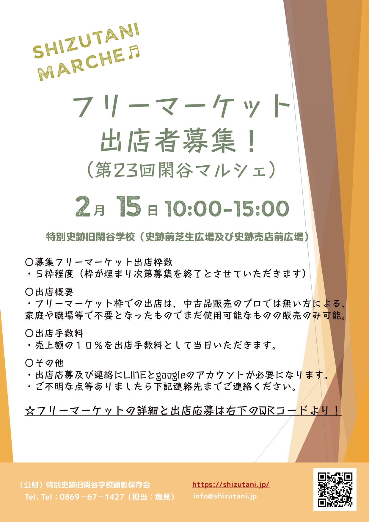毎月第3日曜日に開催されている閑谷マルシェですが、次回2月15日に行われる第23回閑谷マルシェにおいてフリーマーケットスペースを設けて出店者を募集いたします!
